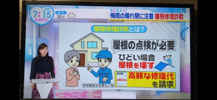 屋根の修理詐欺にはご注意ください。先週から沢山のテレビに出させて頂いておりますが、