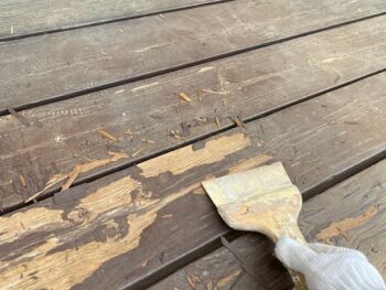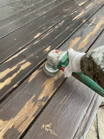 | お客様のご要望 | ウッドデッキに関しましては、あまり塗料で塗りつぶしたくはないのですが(できるだけ防腐剤が良い)、しかし既存の状態がすでに塗りつぶしてしまっていましたので、丁寧にケレンをして下塗りからしっかりと塗布しました。どの位長持ちしてくれるかなぁ~~?! |